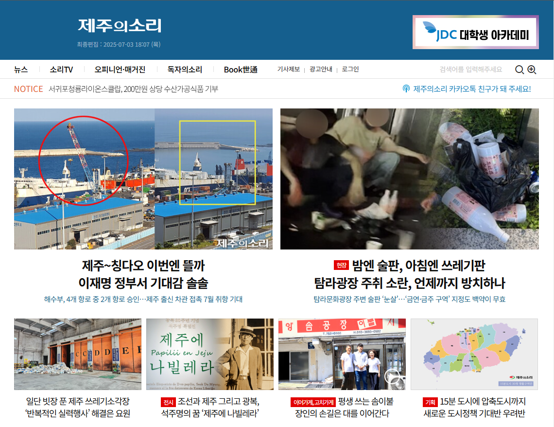 제주의소리 는 제주지역의 다양한 목소리를 생생하게 전하는 인터넷 독립신문입니다. 2003년 창간 이래 지역 주민의 시각을 존중하며 공정한 보도를 지향해 왔습니다.