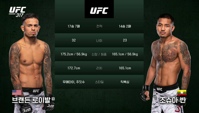 2021년 프로로 데뷔한 조슈아반은 트리플 옵션 파이트 클럽에서 두각을 드러낸 뒤 2023년 UFC와 계약하며 플라이급 랭킹 2위에 올랐습니다. 2025년 6월 열린 UFC 317 메인이벤트에서는 랭킹 1위 도전 자격으로 출전해 세계 팬들의 이목을 집중시켰죠.