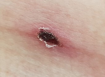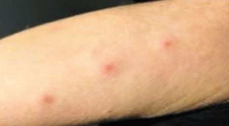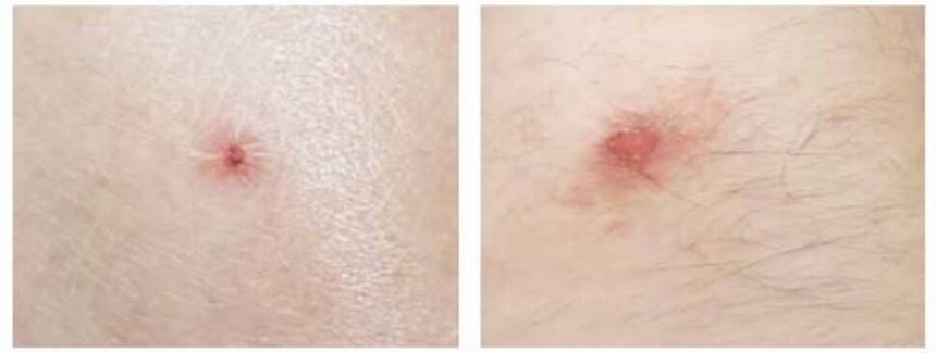 진드기물린자국은 보통 2~3㎜ 크기의 붉은 반점으로 시작합니다. 중심부가 살짝 움푹 들어가 있거나 작은 출혈점이 보이기도 합니다.